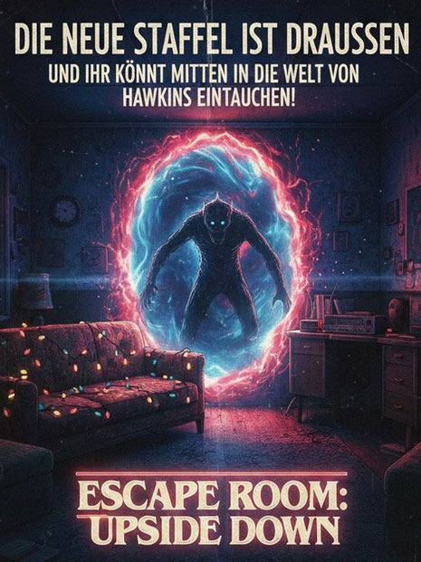Unser Escape Room „Upside Down“ bringt euch direkt in die düstere Schattenwelt: flackernde Lichter, unerklärliche Geräusche und ein Geheimnis, das nur echte Nerds, Abenteurer und Hawkins-Helden lösen können.